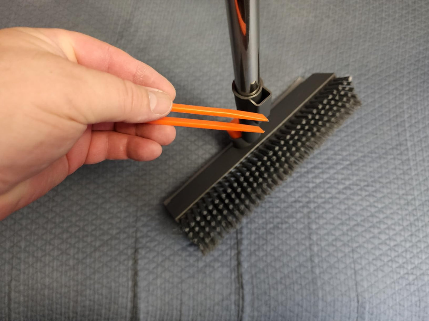 3-in-1 Design — Scrubbing bristles, rubber squeegee, and hair-picking tweezers all built into one handle.
